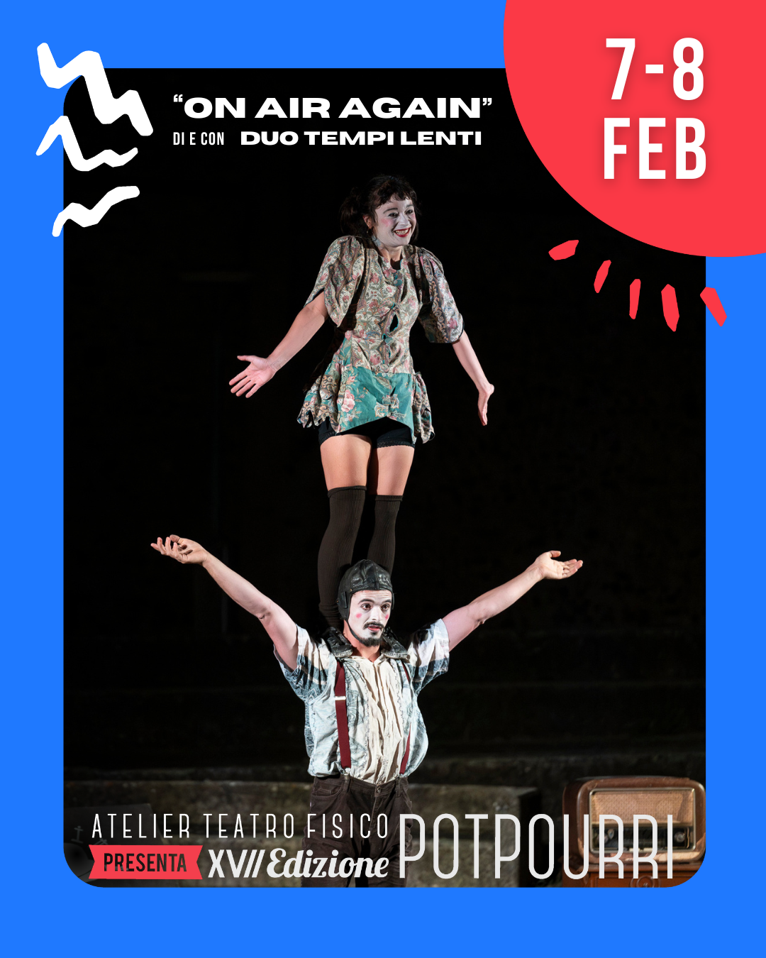Uno spettacolo a basse frequenze, visual comedy, portes acrobatico, monociclo, acrobatica a terra e clownerie.